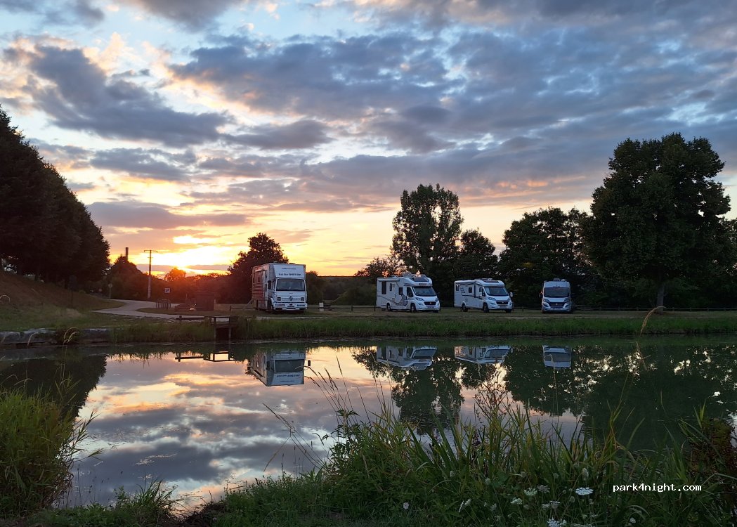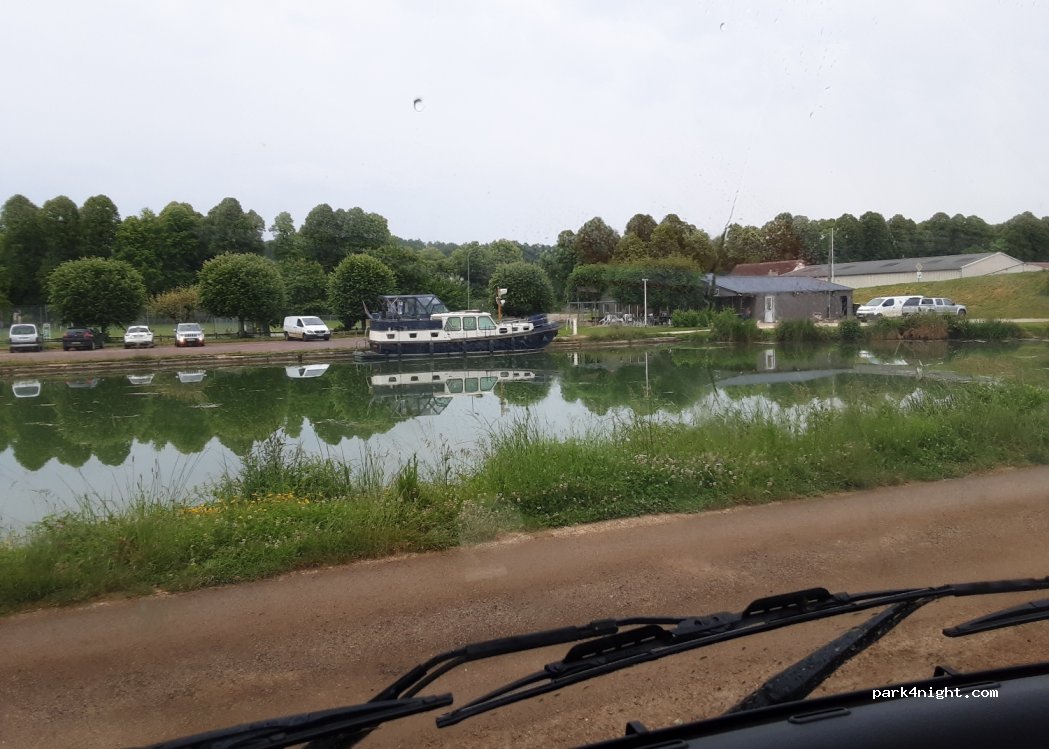 Lieu bucolique au bord du canal de Bourgogne. Nuit calme. Petite boutique de vente de produits locaux. Douche disponible et gratuite et restaurant de l autre côté du canal. Lieu bien entretenu et propre. Poubelles à disposition. Selon les locaux, le parking sera bientôt transformé par la commune en aire payante avec services et électricité. Beau château et commerces dans le bourg.
