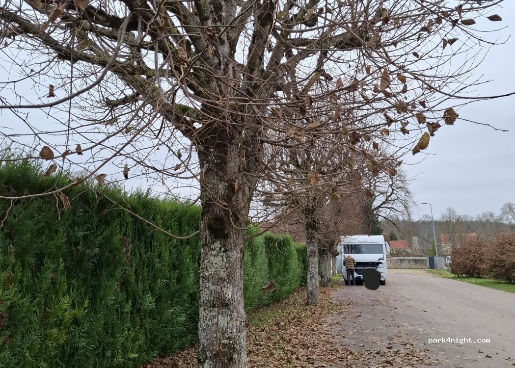 Parcheggio su prato bello largo, facile da raggiungere, comdo per passeggiate in paese e al castello di Tanlay. Ci sono anche delle panchine per pranzare fuori. Noi abbiamo fatto solo un pranzo e siamo stati bene. Non è il luogo più silenzioso che ci sia.