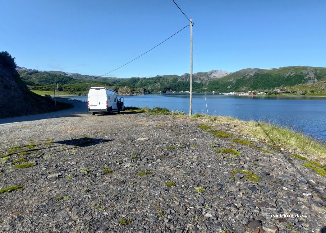 Terre plein au bord d'une route peu fréquentée. un peu en pente. belle vue sur Skjånes.