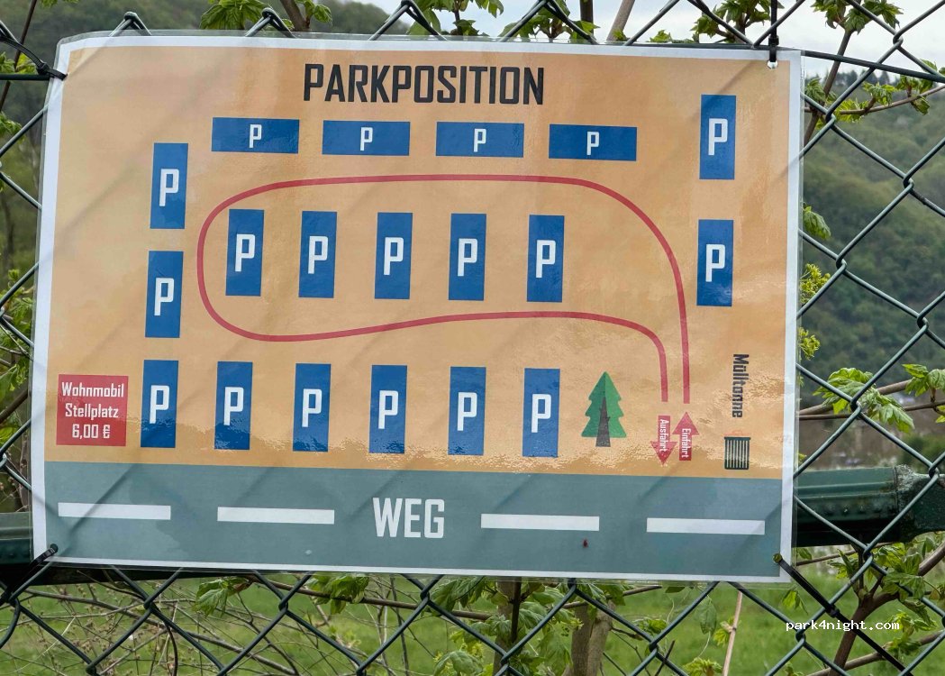Lage: Vorderer Bereich an der Mosel nicht mehr für Wohnmobile zugänglich. Hinterer Bereich noch zum Parken (mit schönen Blick auf die Mosel und die Weinberge) Traumhaft eingewachsen und dadurch kein lauter Lärm von der Hauptstraße. Kassiererin kam um kurz vor 10 uhr zum Kassieren. Es gibt eine große schwarze Tonne und Glascontainer.