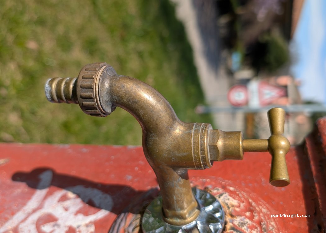 Robinet facile d'accès, dans un endroit agréable à côté d'une aire de jeux, embout compatible avec 3/4 20x27mm, débit correct