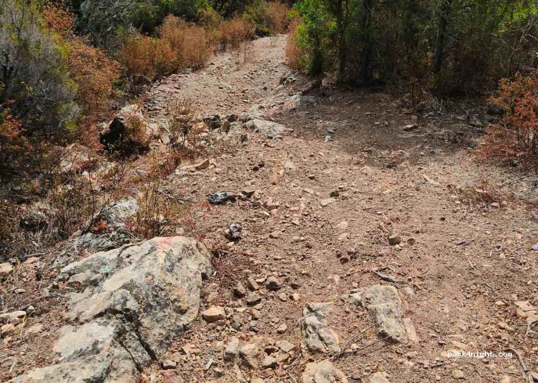 Enger, sehr holpriger, teils steiler Weg führt zu einer kleinen Lichtung