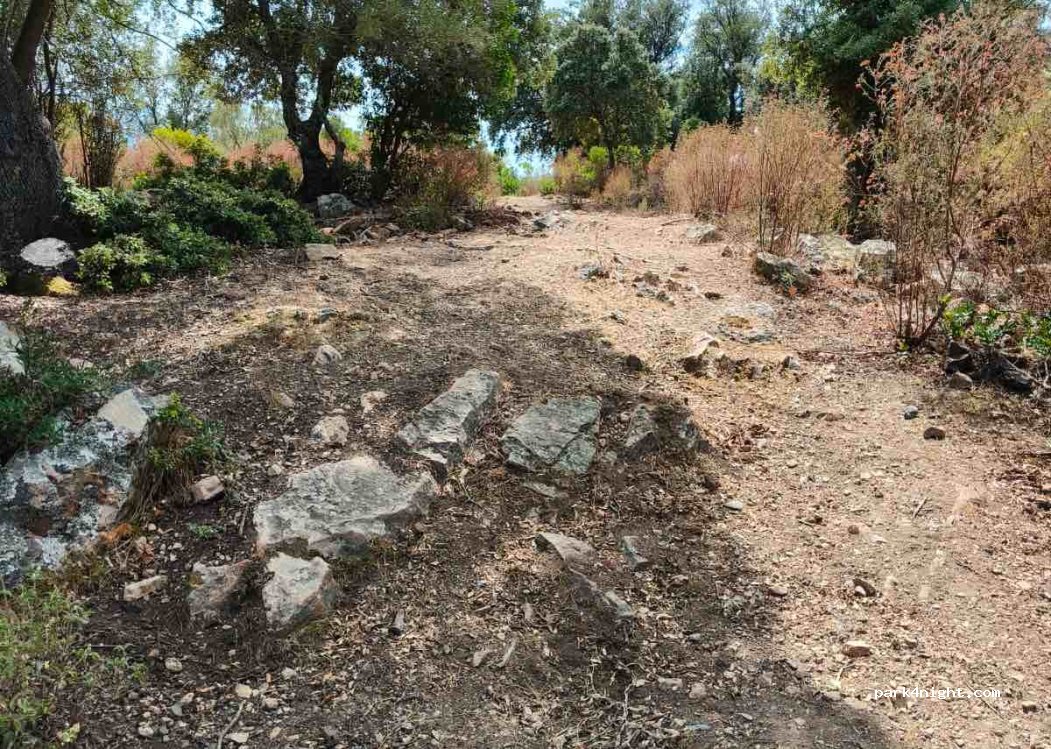 A narrow, very bumpy, partly steep path leads to a small clearing