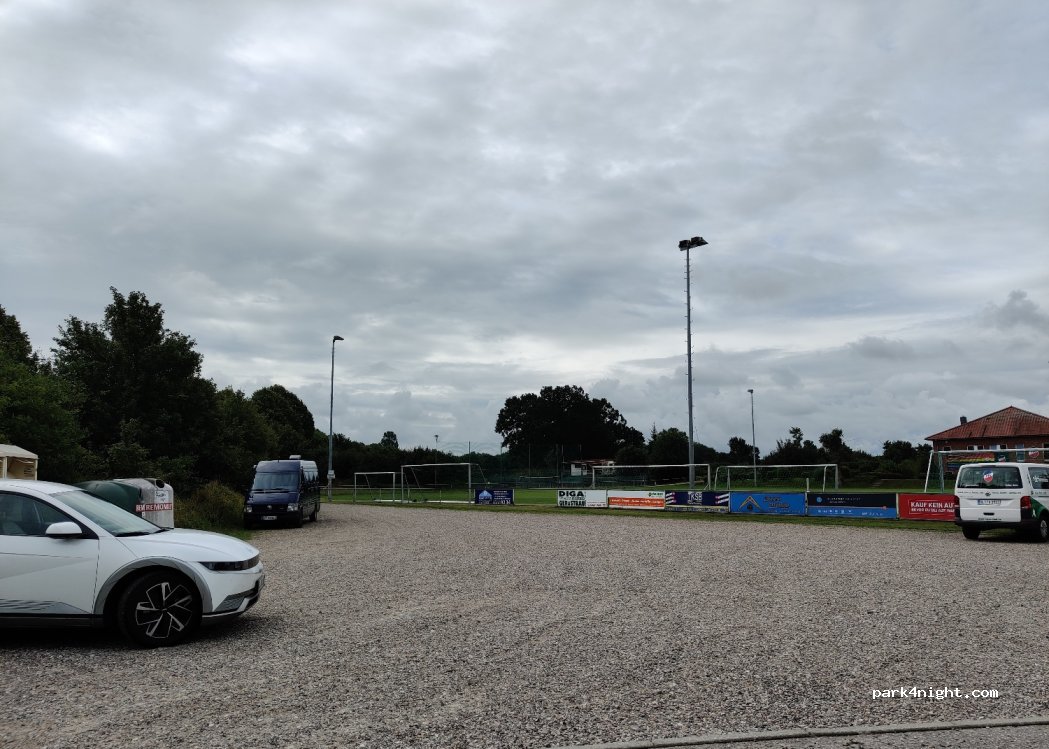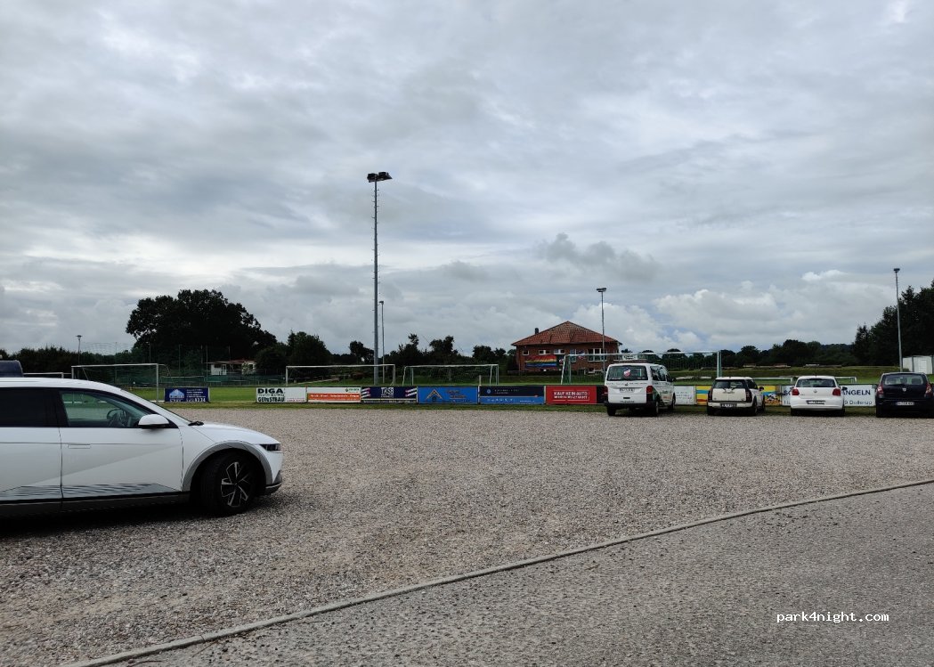 Campo de deportes en un pueblo mucho espacio, superficie plana, justo al lado de una carretera. Si no hay evento deportivo parece estar bien, no hay carteles con restricciones. Estuvimos aquí un martes al azar en julio. El camino estaba bastante ocupado temprano en la mañana con las computadoras, pero aún así dormimos muy bien. No hay instalaciones, necesita su propio baño y electricidad.
