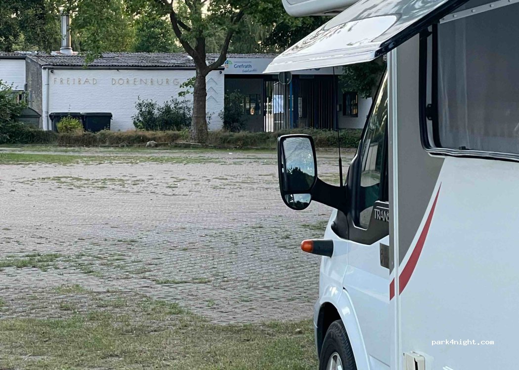 Direkt am Schwimmbad Dorenburg. Sehr ruhig. Großer Parkplatz des Schwimmbades. Tolles kleines Schwimmbad, direkt daneben ein sehr schöner Park mit Spielplatz, Barfußpfad, Sittichen, toll angelegt. Geduldet, wenn keine Stühle draußen stehen!!!