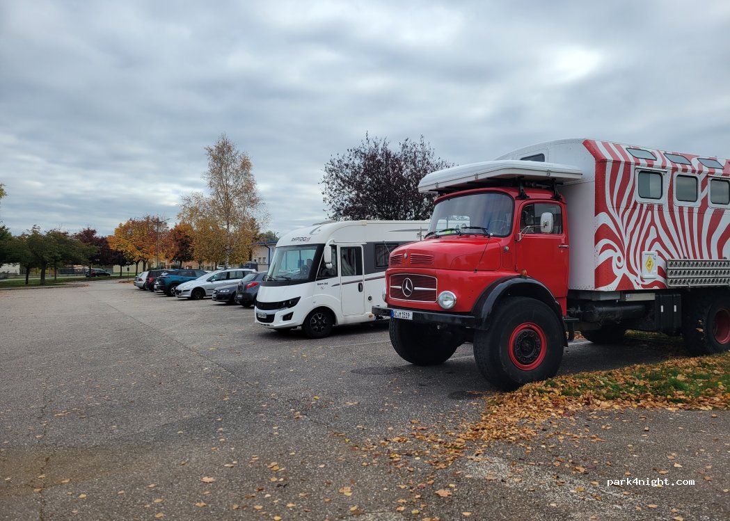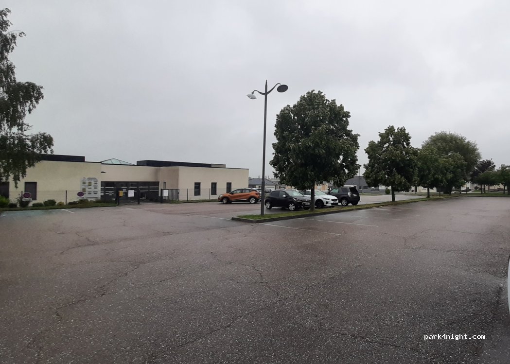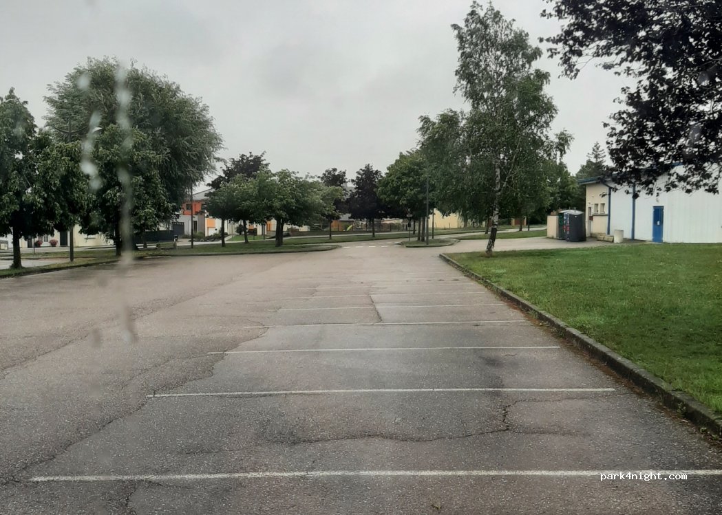 Ruime P aan de rand van de stad bij een school, sportvelden en een gezondheidscentrum. Asfalt, min of meer horizontaal, zon en een beetje schaduw, korte vakken, camper van 5-6 meter mogelijk. Geen voorzieningen behalve een glascontainer en papier. Overdag veel straaljagers en redelijk wat auto’s. In de avond weinig auto’s, maar wel een beetje bravoure van de sportende jeugd. Vanaf 23 uur rustig.