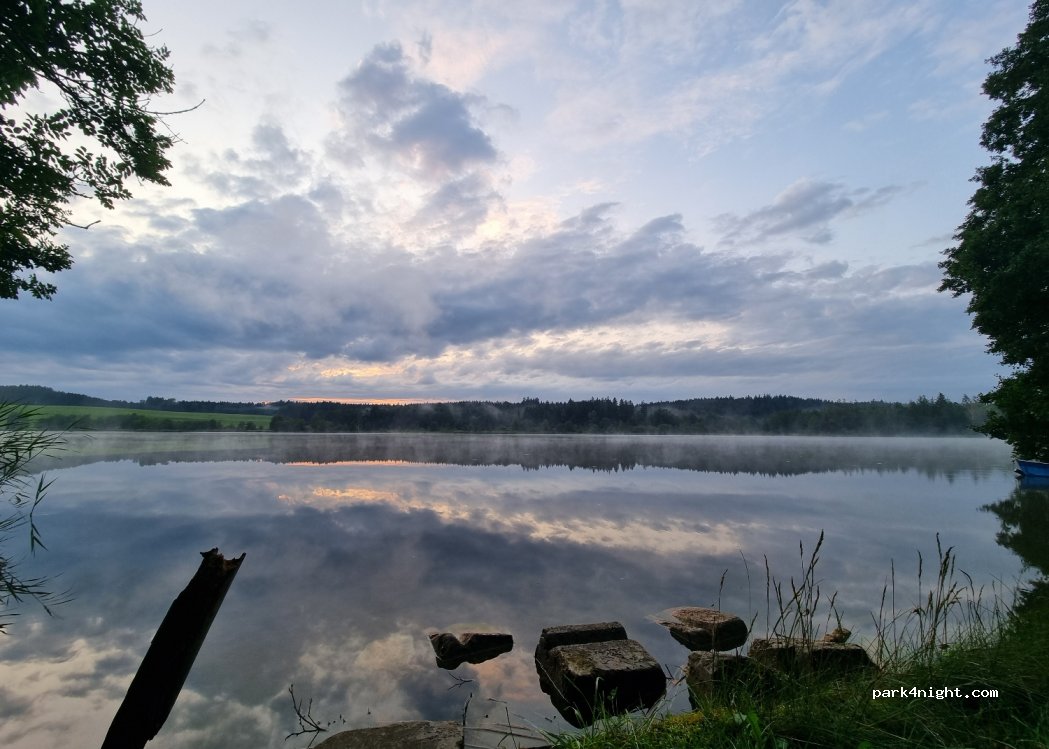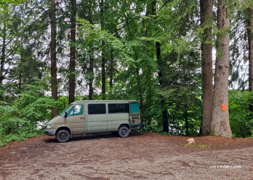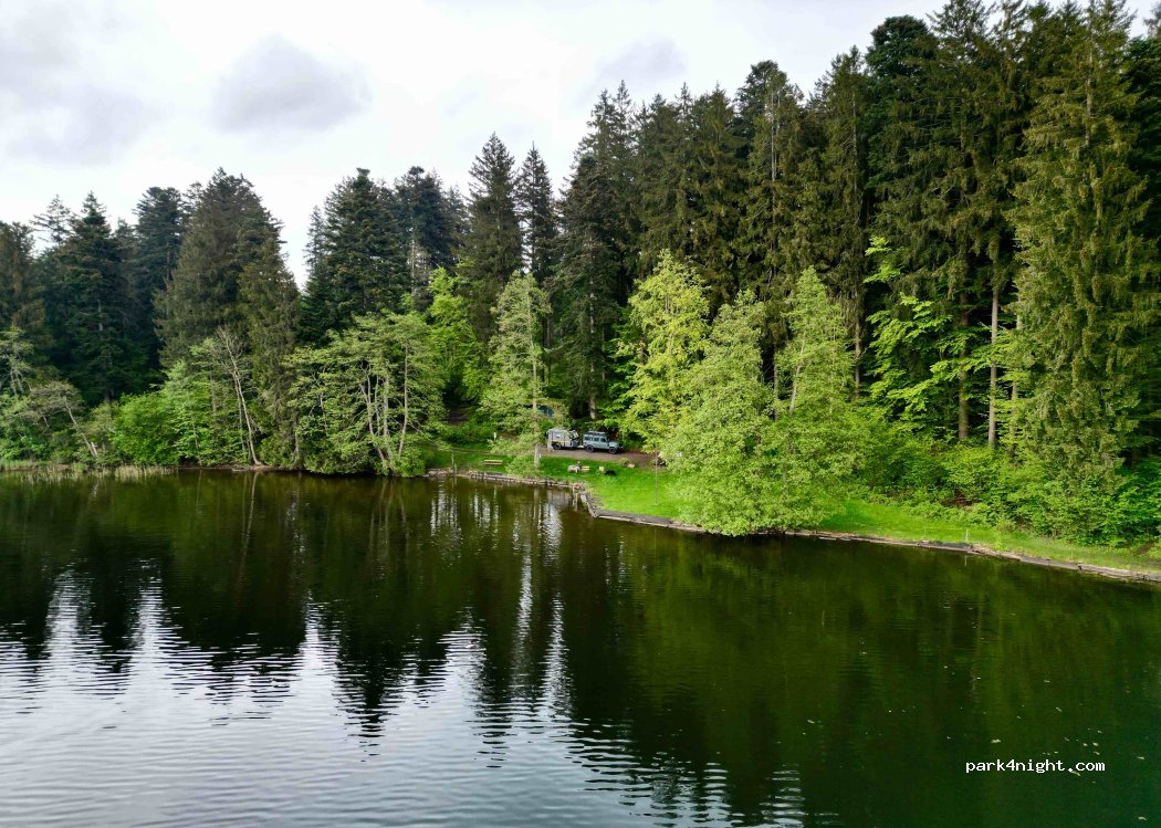 Beau lac chaud avec une petite installation sanitaire, hommes et femmes séparés avec de l'eau courante froide. Le paiement s'effectue sur place à la ferme. Au bord du lac, il y a de la place pour deux mobil-homes et plus loin dans la forêt pour trois mobil-homes. (Bus) C'est un sous-sol boisé, humide qui descend fortement à la montée et à la descente, il est préférable de le visiter à pied au préalable.