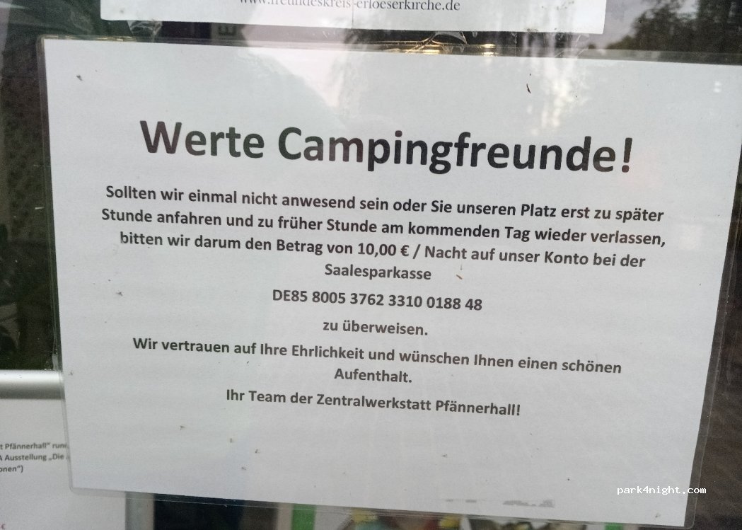 Mostly flat terrain, no shade in front of the museum, trees on the side. Basement with meadow. Center within walking distance. On site: bicycle rental, lit parking space, dogs allowed. Nearby: swimming lake, marked cycling and walking trails, diving. Price per night including two adults: 10 euros (cash only!) Payment: Museum operator. Museum open Wednesday to Sunday from 10:00 a.m. to 6:00 p.m. Open every day during the summer holidays. Leisure activities: Around the Geiseltalsee (diving, swimming, cycling, hiking, boat rental, water activities). Marina Braunsbedra with a 300 m long pier. Munich marina. Directly at the central workshop of the Pfännerhall is the industrial monument with the exhibitions on mining in the Geiseltal, the Pfännerhall site with the forest elephant, the sea eagle and the prehistoric horse. ABORA exhibition - a transoceanic sailing expedition, exhibition on the ICE route Halle-Leipzig/Erfurt and the balance bike by Michael Kaßler