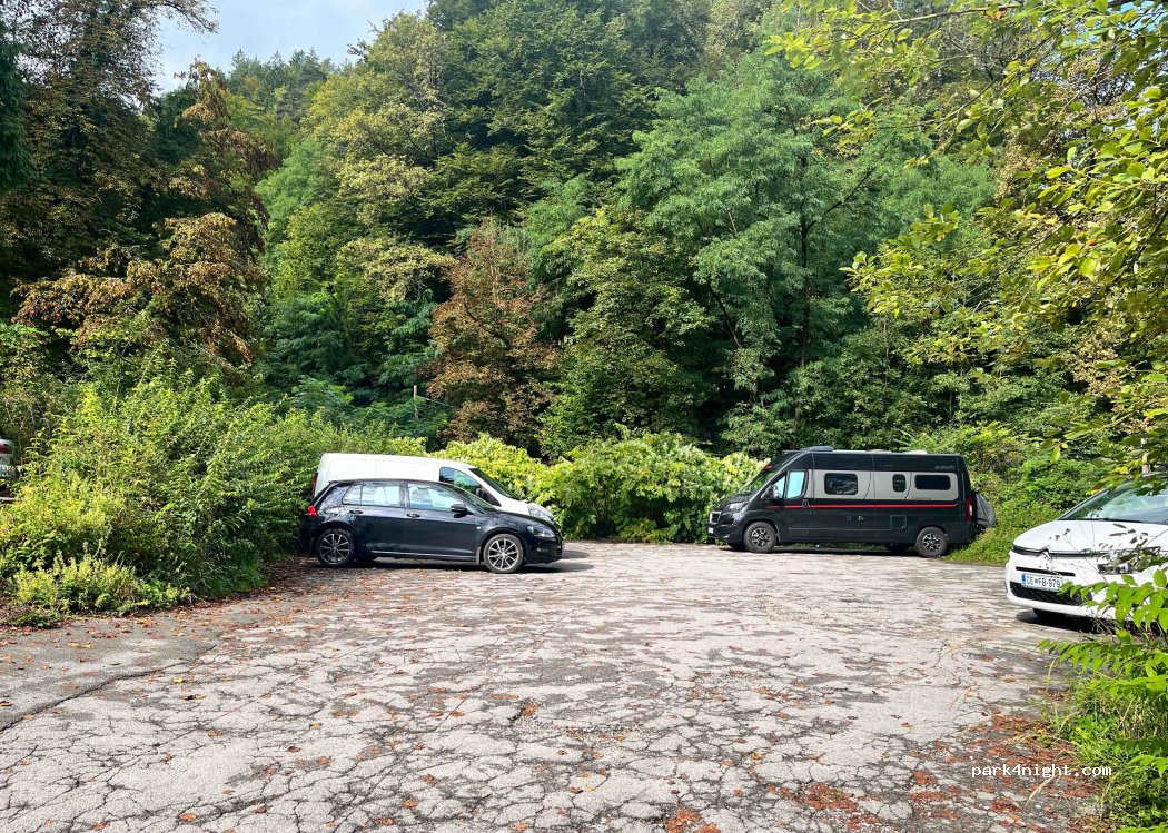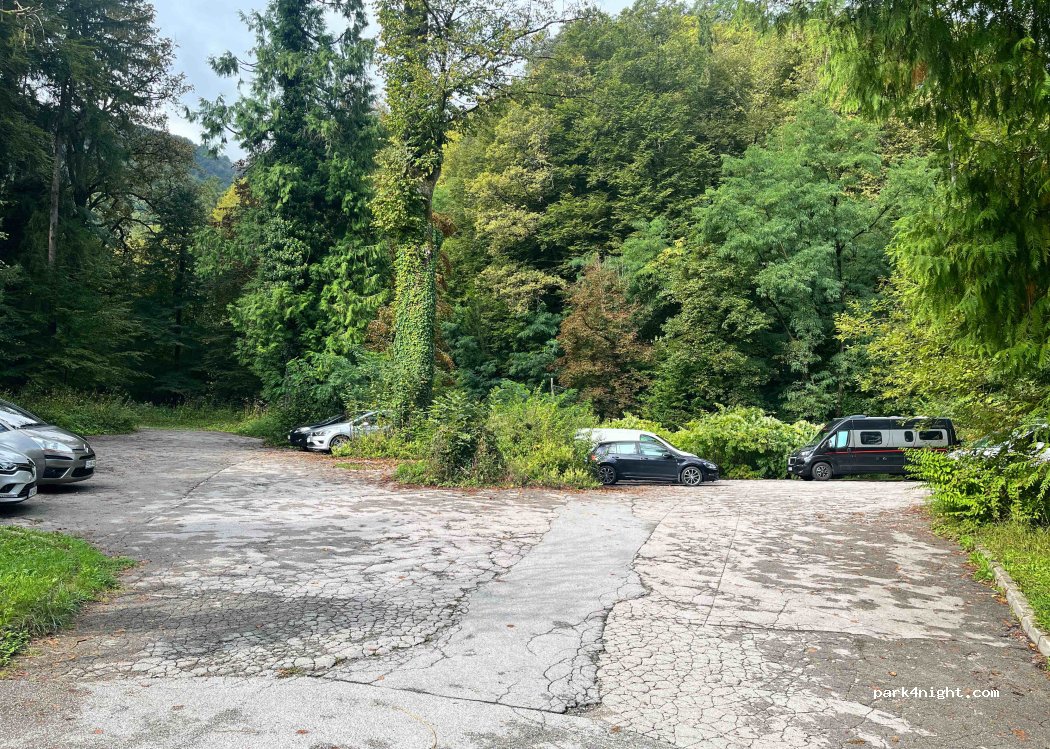 Small flat section of the parking lot of the Roman Baths (Rimske Toplice). A bit hidden, trees all around.