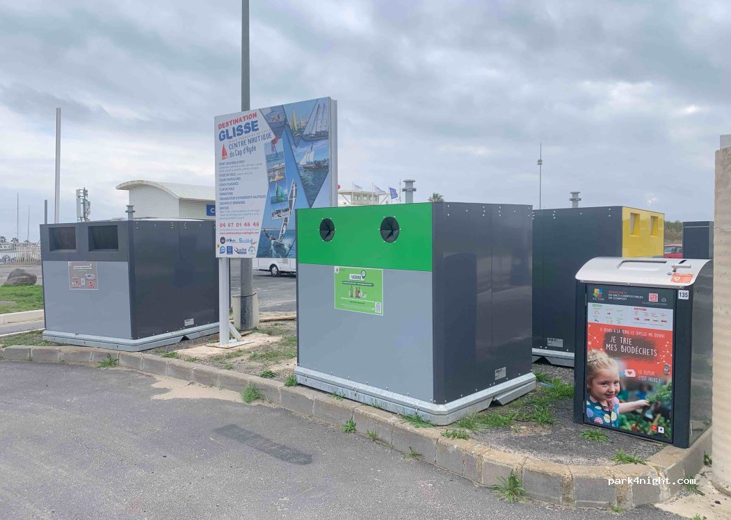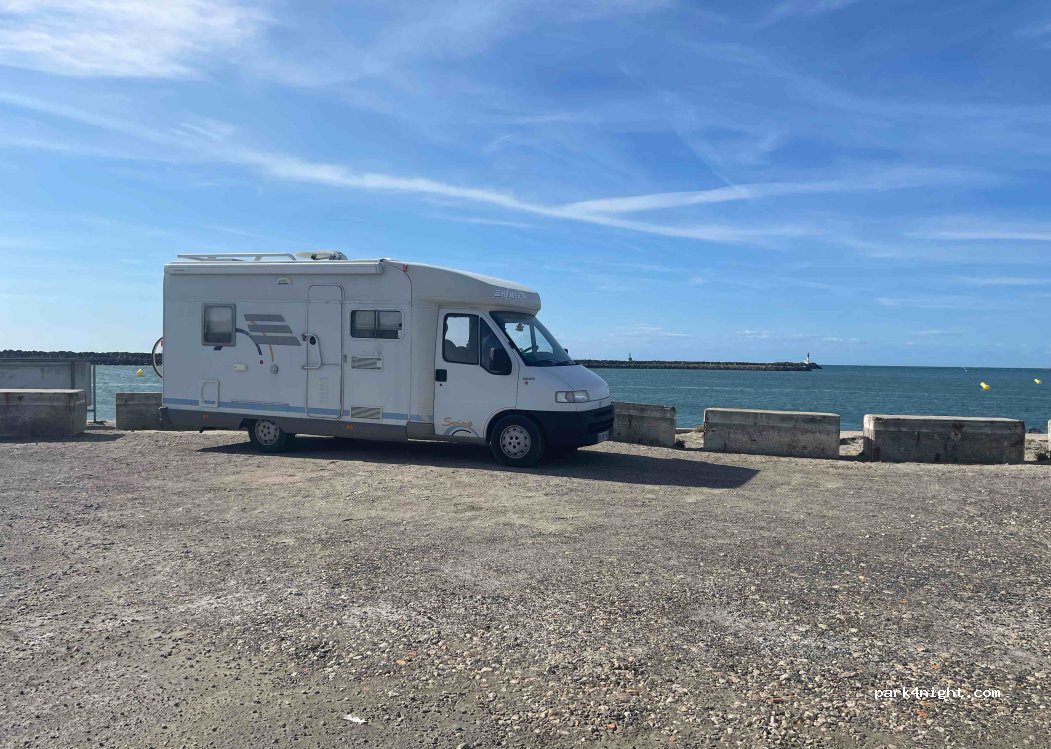 Très grand parking goudronné et à plat. Très calme. Sans services. Très belle vue sur la sortie du port et le Fort Brescou. Gratuit hors saison.