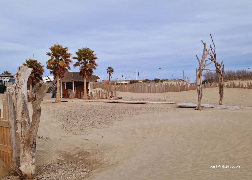 Un parking gratuit hors saison . Les pieds dans l’eau , plage sur la parking . Éloigné de la ville . Hors saison c’est vide donc une belle nuit au calme . Ça reste un bon plan. Pas de limite hauteur . Attention en saison c’est payant .