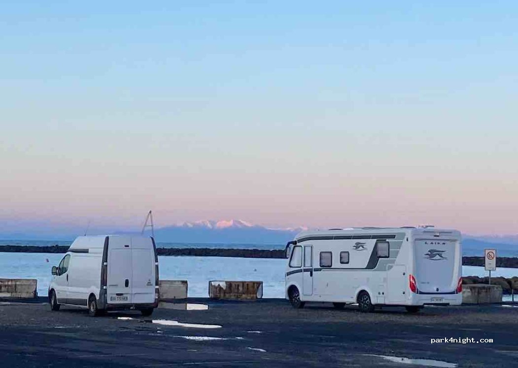 Très bon spot pour une nuit ! C’est un parking sans aucun charme apparent, et sans service. Au réveil, magnifique vue sur les Pyrénées, et les voiliers passent devant le pare brise pour entrer et sortir du port. Plutôt calme à Pâques, pas de barrière.