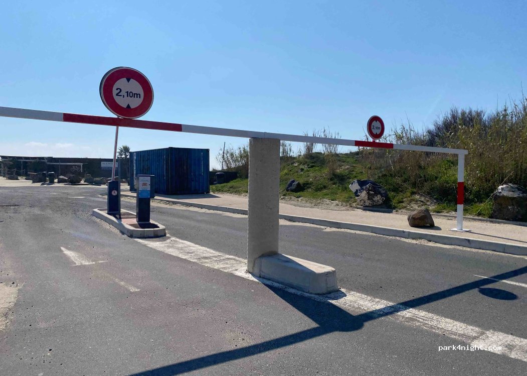 No barriers or height restrictions Dec 2025. Perfect location on the waters edge, the beach is a few steps away, a nature reserve and walk way to the lighthouses. If you love nature, running/walking or have dogs its perfect. It's a car park so no services bar garbage cans. Carrefour and laundromat 10 mins walk away. Close to the Christmas village by bike/car. Several motorhomes here feels safe.