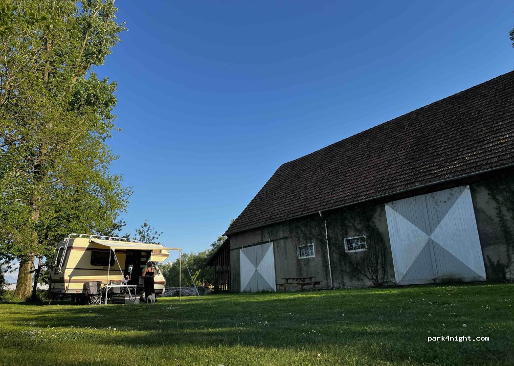 Schöner, ruhiger und gemütlicher Stellplatz hinter einer Scheune auf einem Gutshof mit Blick auf Felder, Kühe und Wiesen. Man steht alleine und hat definitiv Ruhe. Sehr netter Gastgeber. Hunde willkommen! Mit 25€ nicht ganz billig, aber definitiv zu empfehlen