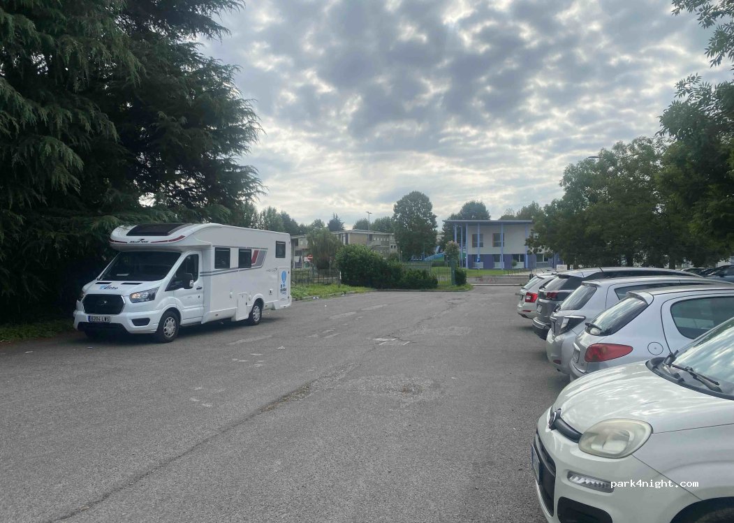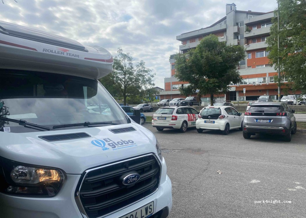Parking en zona residencial, alejado del centro pero bien comunicado. A 100 metros de la línea de autobús 8 o 9 hasta "Puerta Nueva" y desde allí la línea 1 hasta el funicular que sube a la zona alta de Bérgamo (casco antiguo). Cuando llegamos a las 18:00h seguíamos sin poder acceder al centro (ahí hay un parking de caravanas) porque hay restricciones ATL e imponen multas, así que preferimos no arriesgarnos. Encontramos este sitio, con muchos sitios gratuitos y era viernes. Sin problemas para pasar una noche y ver la ciudad. Es julio, calor y mosquitos. Siendo viernes, la zona a veces es ruidosa con gente que viene a recoger los coches, pero dormimos bien. centro veterinario al frente.