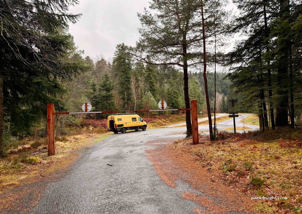 Barre à 1m90 donc notre L2h2 boxer ne passe pas. Nous nous sommes garés sur le parking devant la barrière, il y avait 2 autres camping car. Spot ombragé, des tables non loin de pique Nique. Pipi facile faisable pour les personnes à vagin dans la forêt. De passage 1 nuit qui fut troublée par les ébats sexuels du camping car voisin. Spot sympa