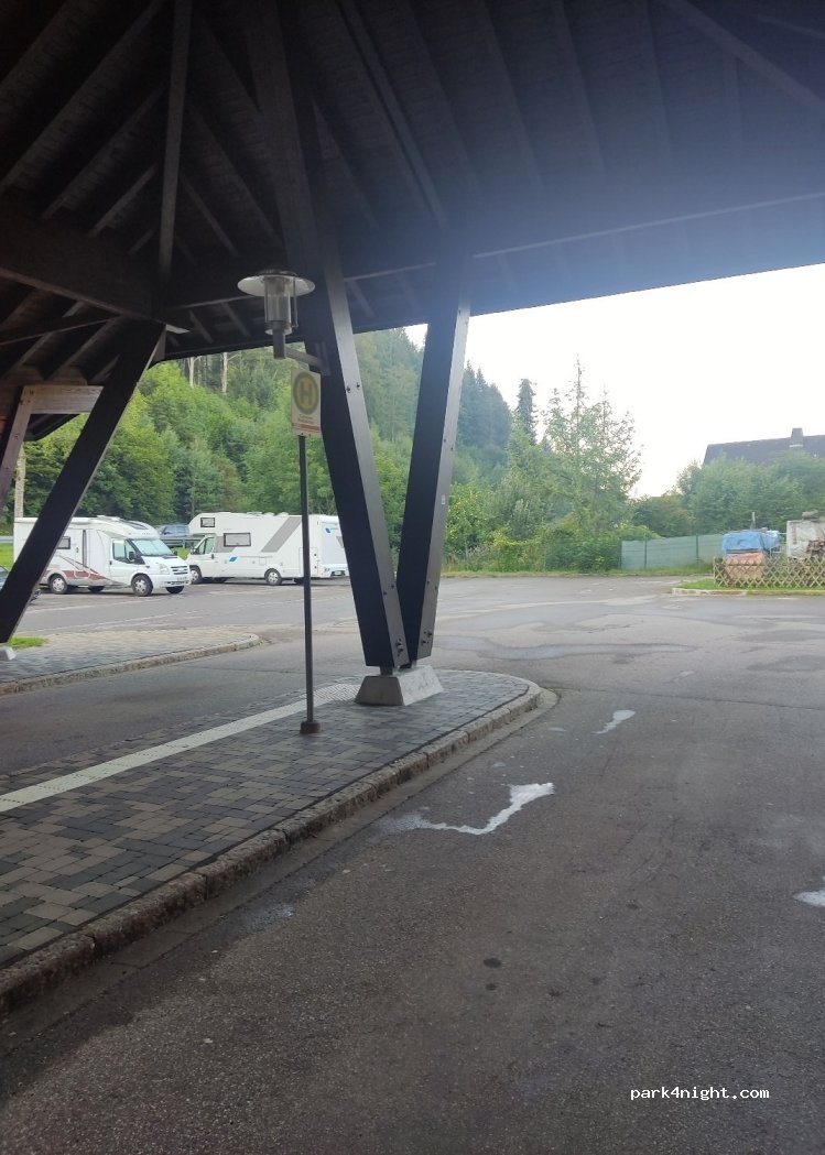 Parken rund um den Busbahnhof Todtmoos. Der Busbahnhof verfügt über eine öffentliche Toilette mit Zugang zu Wasser. Ganz in der Nähe des Stadtzentrums. Tagsüber herrscht Verkehr, nachts ist es jedoch relativ ruhig