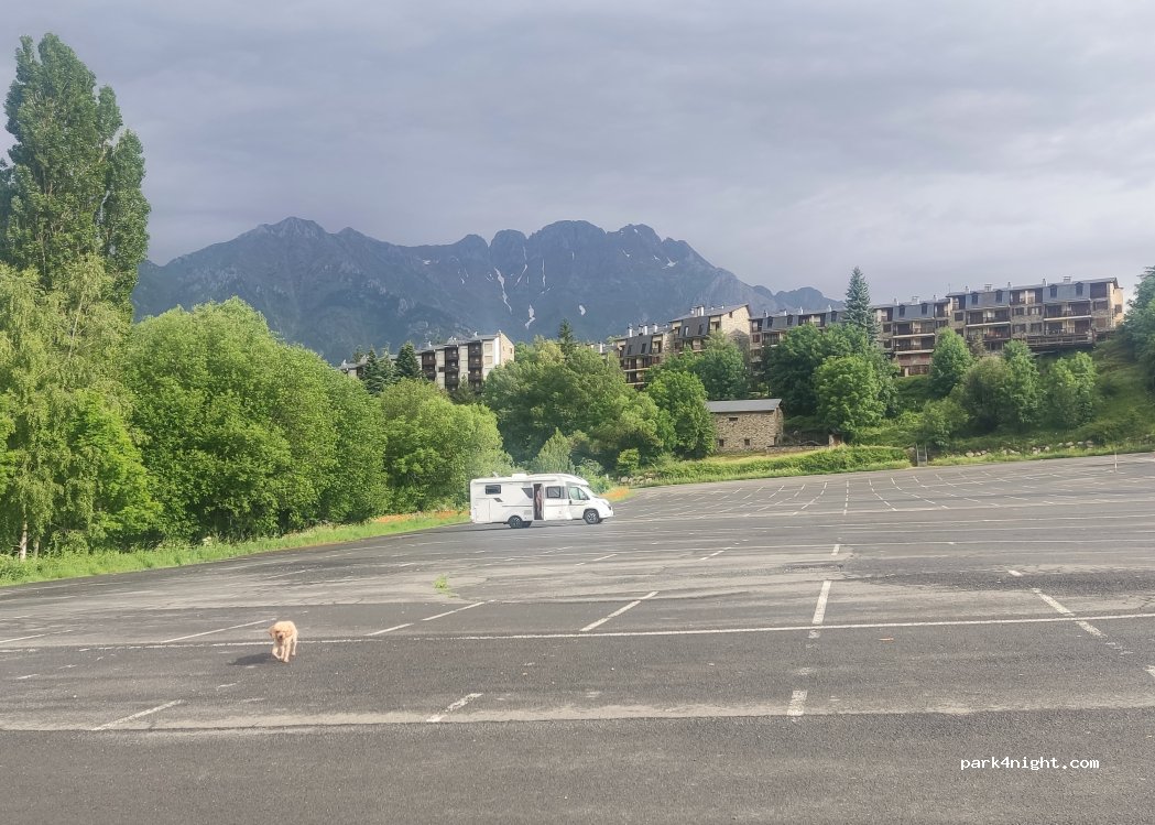 At the parking of the ski resort, close to Cerler village. Very good place, no service but great view and good for one night. We are stationed at the edge of the river. free wifi station