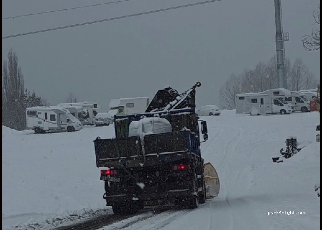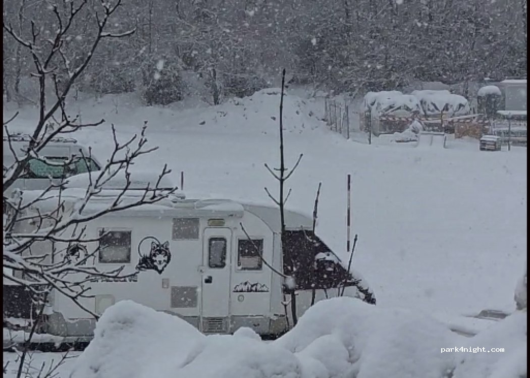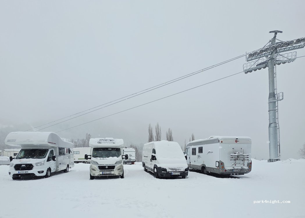 Au parking du station de ski, à deux pas de village Cerler. Trés bon endroit, pas de service mais superbe vue et bon pour une nuit. Nous sommes stationnés au bord de la rivière. wifi de la station gratuit