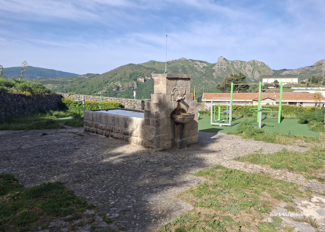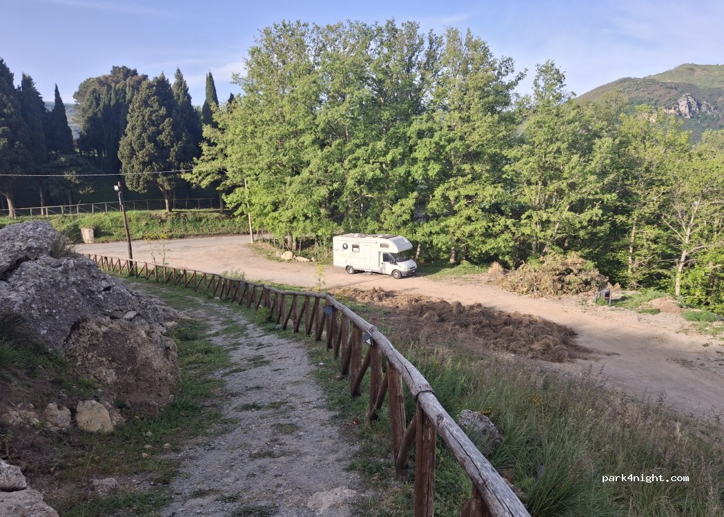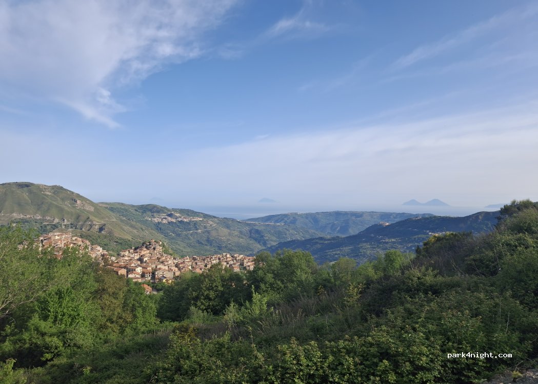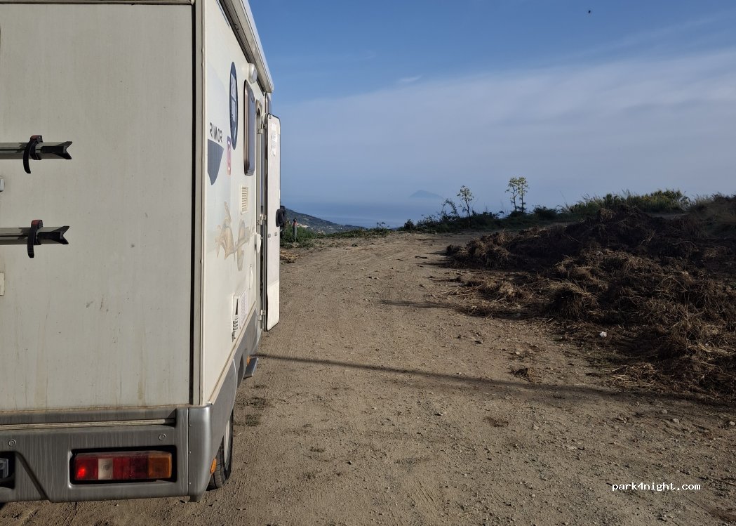 Le spot ne semble plus accessible. Le lieu était fermé et il y avait un fort éclairage sur la zone de pic-nique alors qu'il n'y avait personne. Nous nous sommes mis plus bas avec le camping car sur une zone de replat à côté de la butte avec le banc géant "touristique" (coordonnées 38.025582,14.778011). Belle vue sur la vallée, la mer et les îles éoliennes.