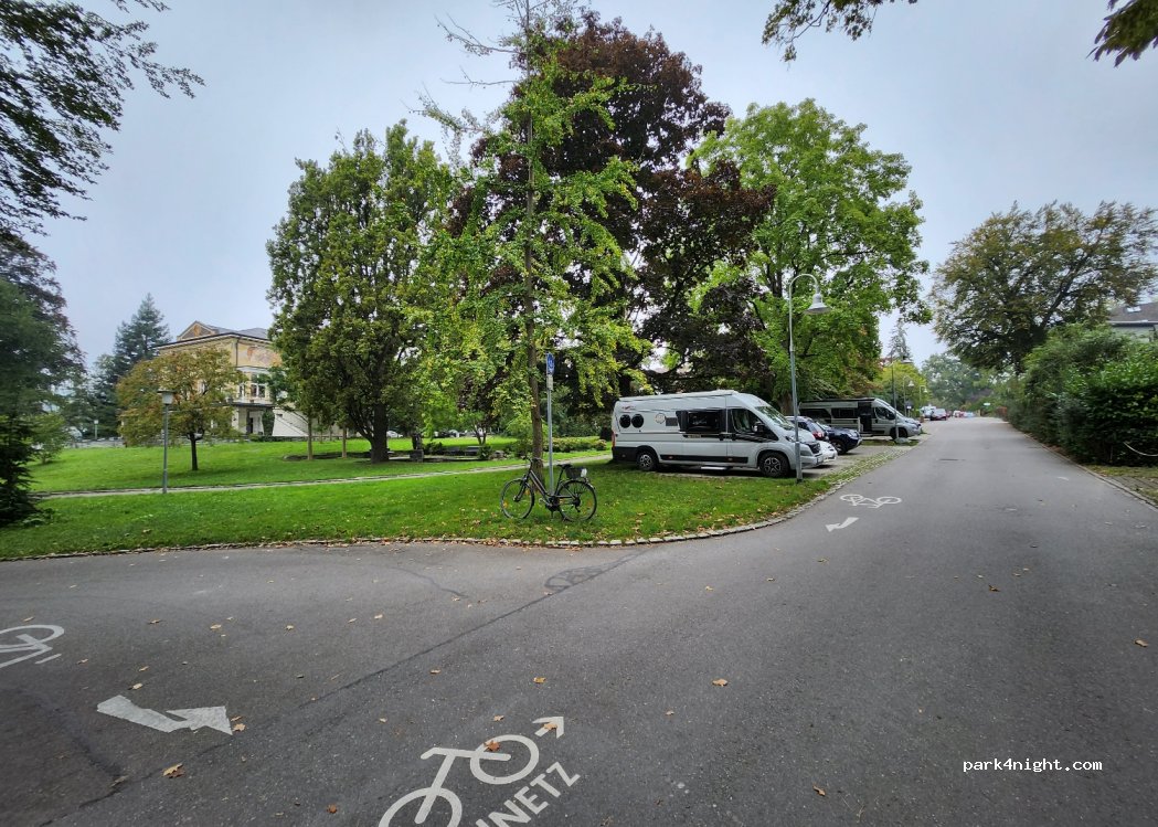 Stand hier gut tagsüber in PKW Parkboxen. Dahinter ist Rasenfläche, so dass ich auch mit 7m Womo klar kam. Startpunkt für schöne Fahrradtour entlang der Seepromende zur Altstadt.