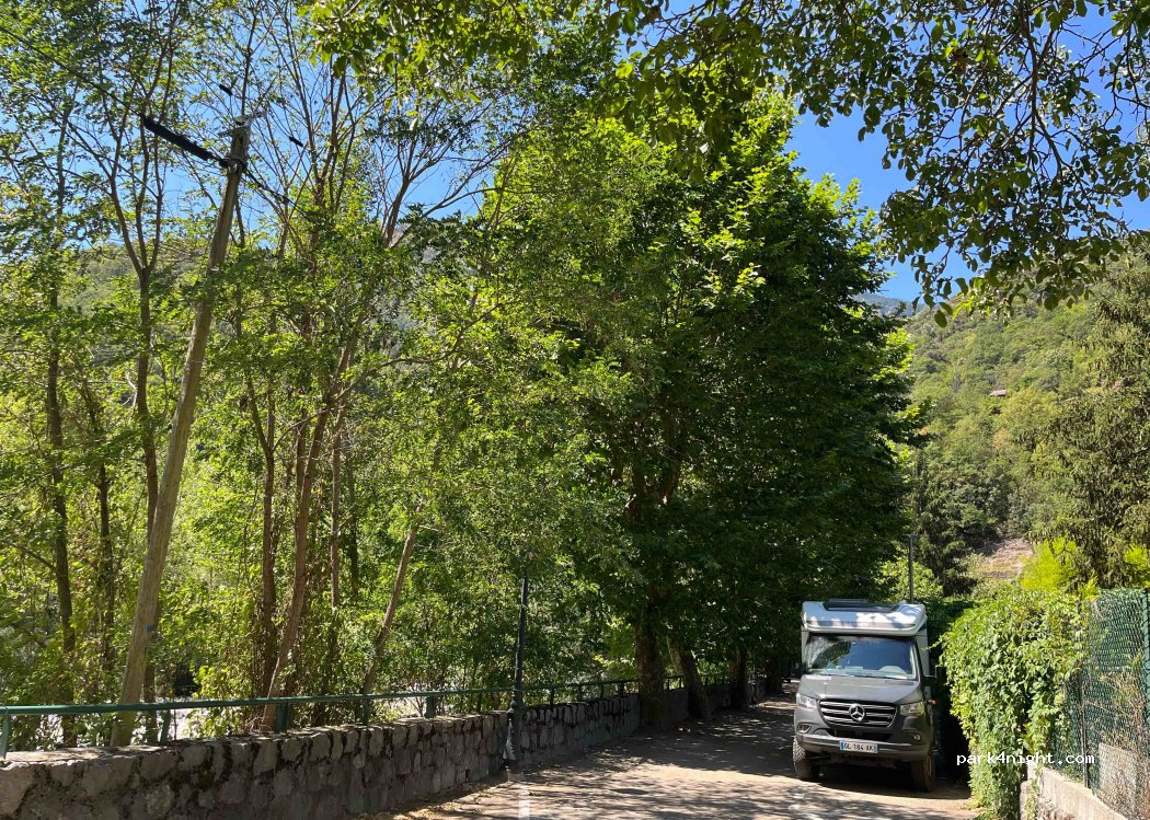 Along the Tinée alternate parking spaces on a low traffic lane. wc. At the bridge, near the village