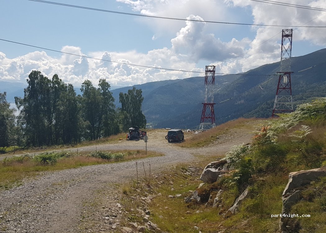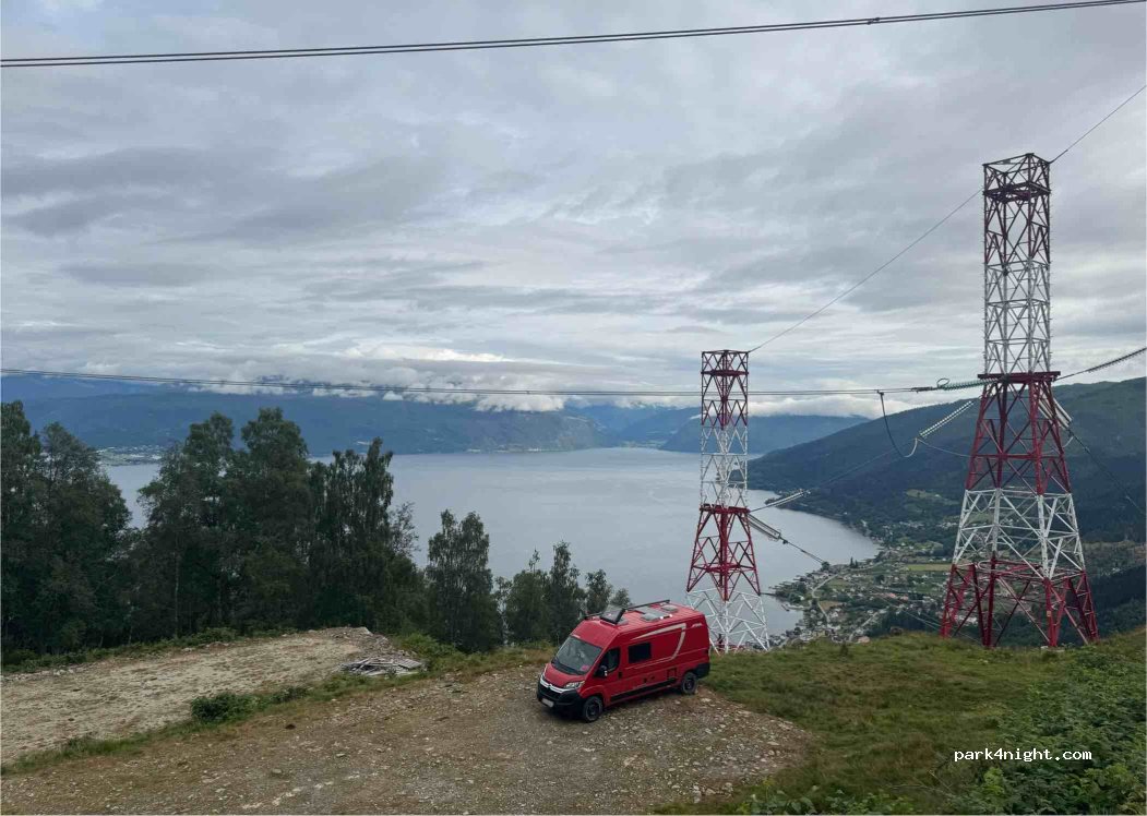 Cooler Platz mit schöner Aussicht auf den Fjord. Uns waren die Hochspannungsleitungen zum Übernachten zu nah dran, daher sind wir abends weiter gefahren. Zum Spazieren und Wandern ein super Parkplatz. Unten am Tor zahlt man die Maut via Paypal.
