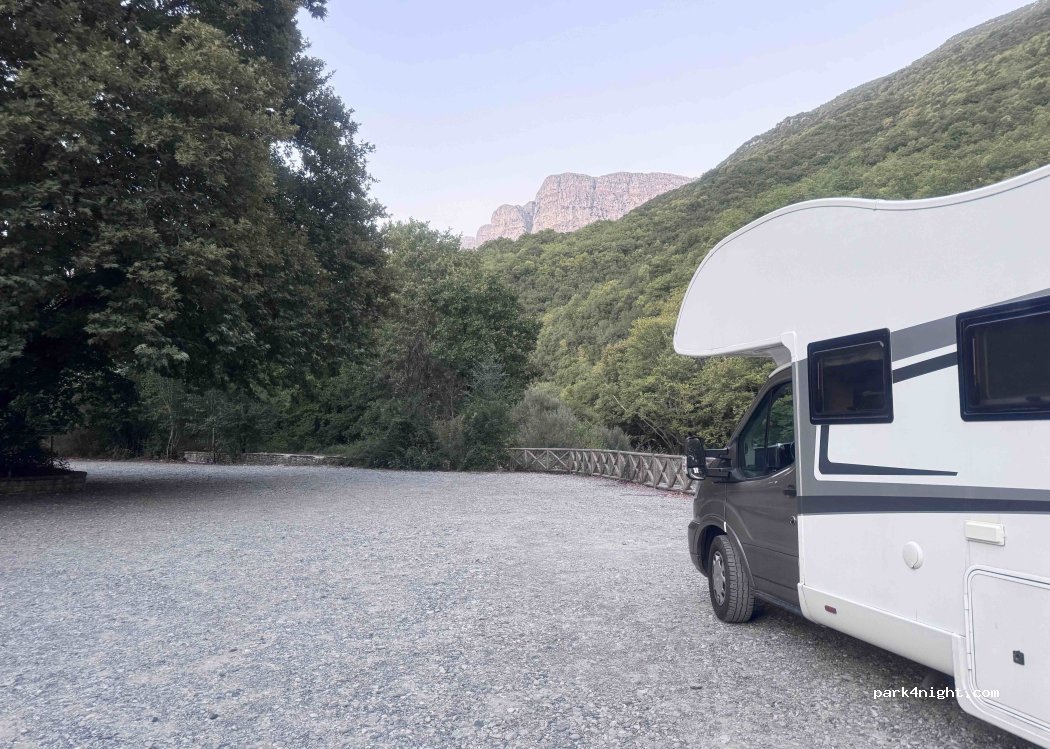 Place de parking à proximité de la rivière la plus claire (Voidomatis) d'Europe. Très bel endroit pour faire une randonnée ou faire du rafting. Si vous n'avez pas peur, l'eau de la rivière est potable !