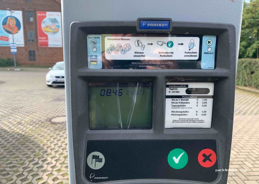 Kosten von 0-24 Uhr 5 Euro. Um Mitternacht endet die Parkzeit, das steht auch auf dem Automaten. Man muss also um Mitternacht immer erneut 5 Euro einwerfen, wenn man übernachten möchte. Dieser Parkplatz ist für Wohnmobilisten völlig ungeeignet. Wir sind wieder weg gefahren.