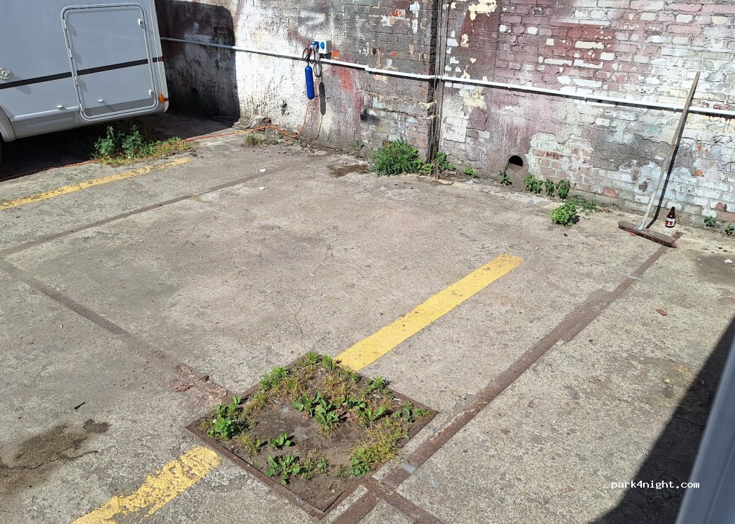 fantastische plek, ruw, rauw maar heerlijk industrieel. absoluut veilig. receptie annex restaurantje is op ongeveer 200 meter van de camperplek. Toilet en douches schoon en netjes, toegankelijk via code in het receptie gebouw. stad is op 10 minuten lopen, foodhal op 2 minuten lopen. heerlijk plek maar moet wel bij je passen.