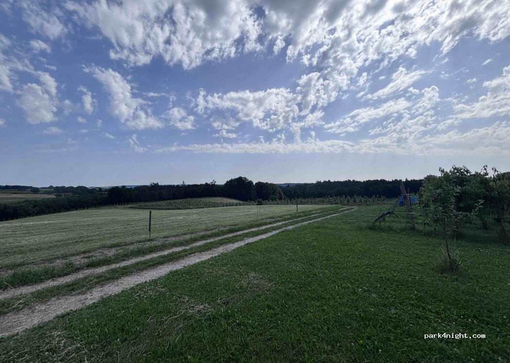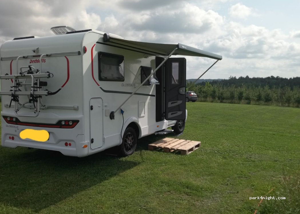 A small beautiful family fruit farm surrounded by horses and rolling hills. Stayed here one night, 20€ cash (1 person, 1 campervan, 2 dogs) only 2 places available. 1 shower & toilet are nice and clean. Owner was nice and friendly. Electricity, bins and water were available.