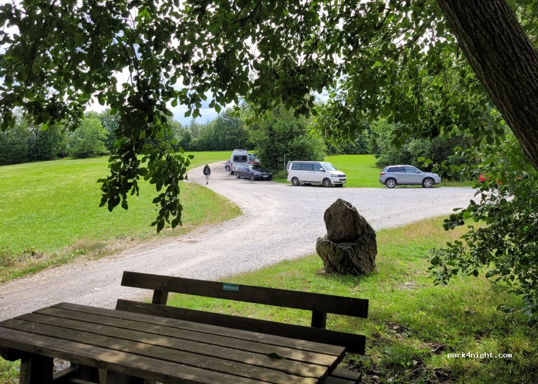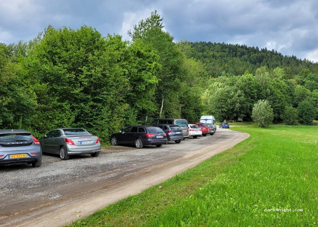Hikers' car park, quiet location, well frequented during the day, with hiking board, table and bench.