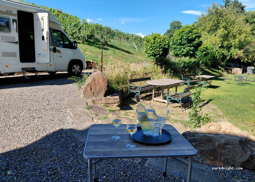 Sehr guter Stellplatz. Wir hatten eine top Weinprobe, der Winzer war echt Mega. Am nächsten Tag haben wir wir noch ein paar Geschenkartikeln bei der Mutter gekauft und natürlich 3 Kisten Wein. Gaststätte neben an nur 80m, ging so. Für große Wohnmobile ist die Einfahrt hinten über die kleine Kapelle.