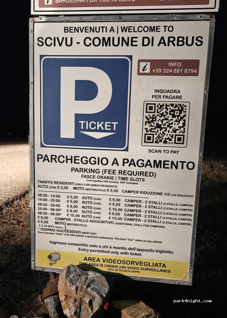 Gebührenpflichtig bis Dezember, laut Schild an der Kasse. Vorsicht die Polizia Lokale der Comune Arbus war am 5.10.2023 auf dem Platz und hat die Camper fotografiert die z. B. nur ein gekipptes Fenster hatten, gilt als Camping! Also nur Dachfenster öffnen.