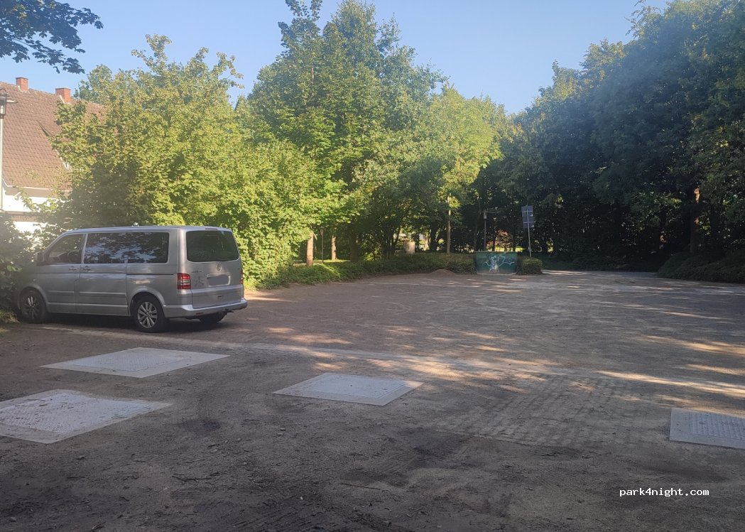 Kleiner Parkplatz, neben einer Sportanlage und einer Wohnsiedlung.