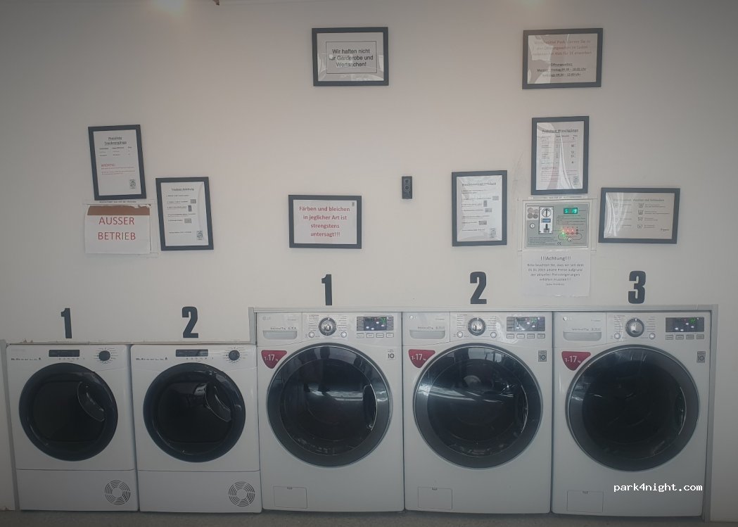 Lavandería municipal autoservicio. Dispone de 3 lavadoras de 17 kg cada una y 2 secadoras de 10 kg cada una. Se paga con monedas. Traiga su propio detergente para ropa. Muy limpio y dueño muy amable. Es difícil aparcar con una casa móvil, pero hay un gran aparcamiento a 1 km.