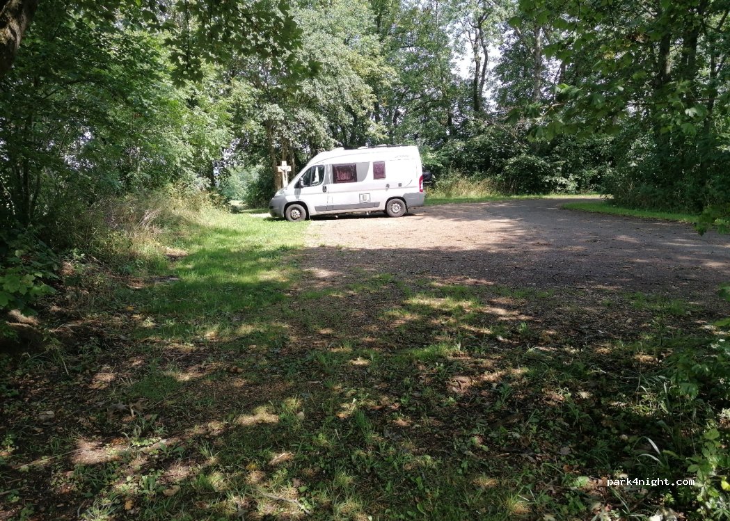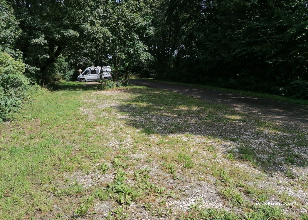 Stationnement de randonnée de niveau avec gravier. Entouré d'arbres et de prairies. Rue audible la nuit mais calme. Facilement accessible depuis l'autoroute.