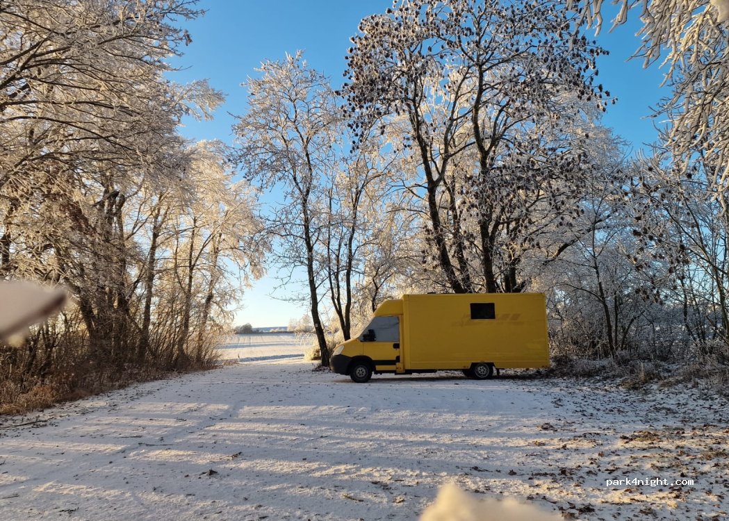 Ebener Wanderparkplatz mit Schotter. Umgeben von Bäumen und Wiesen. Straße hörbar Nachts aber ruhig. Gut von der Autobahn erreichbar.