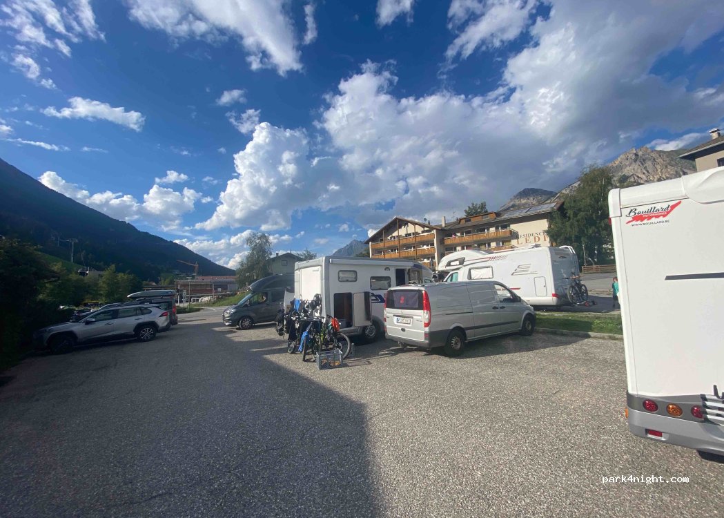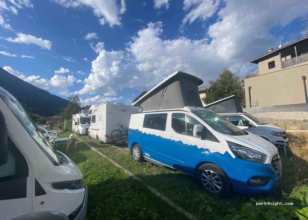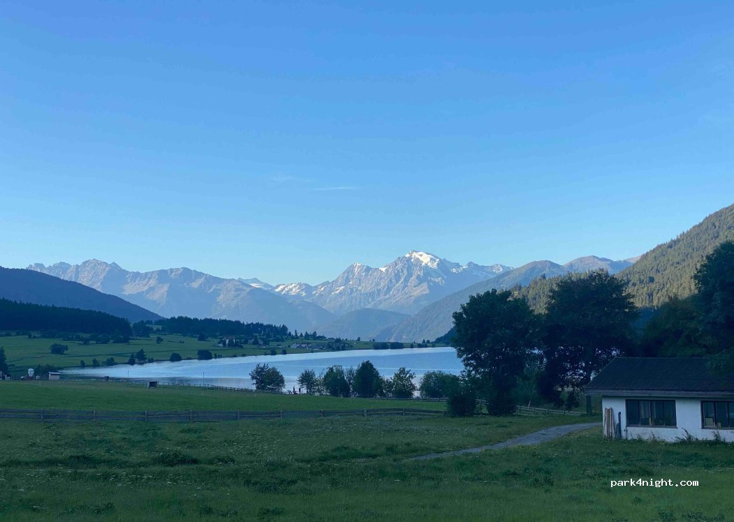 Magnificent view of the small lake and the surrounding mountains. Descent into the high mountains with the cable car 100 m away. Bakery in town (closed on Sundays), small supermarket 600 m further on the main street. Space for a dozen campers, depending on size.