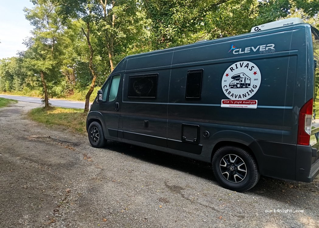 Es un aparcamiento lateral a la carretera. Es muy cómodo y tranquilo. Junto a él hay un sendero y a 50m tienes una capilla de piedra. El pueblo es muy pequeño pero encantador.