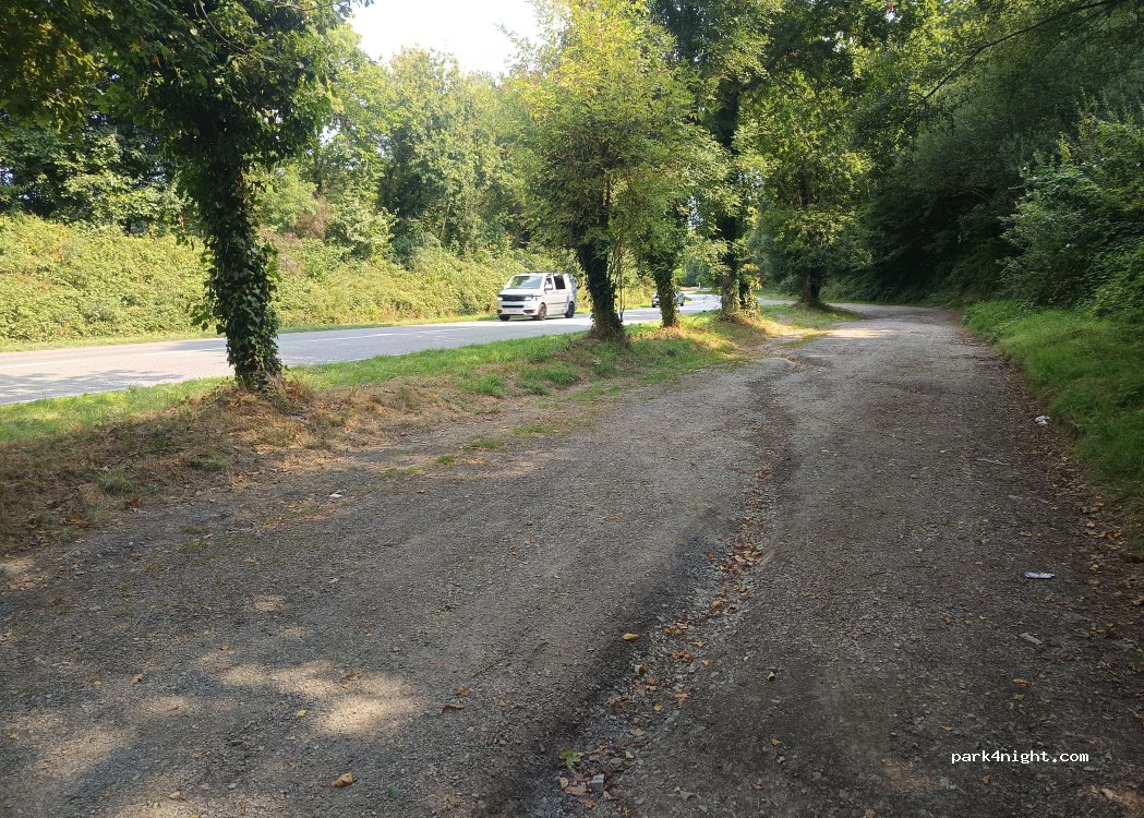 Parallèle à la route. Stationnement en ligne facile. Partagé avec les voitures. On monte au bourg par un chemin boisé qui se termine par un joli ermitage.