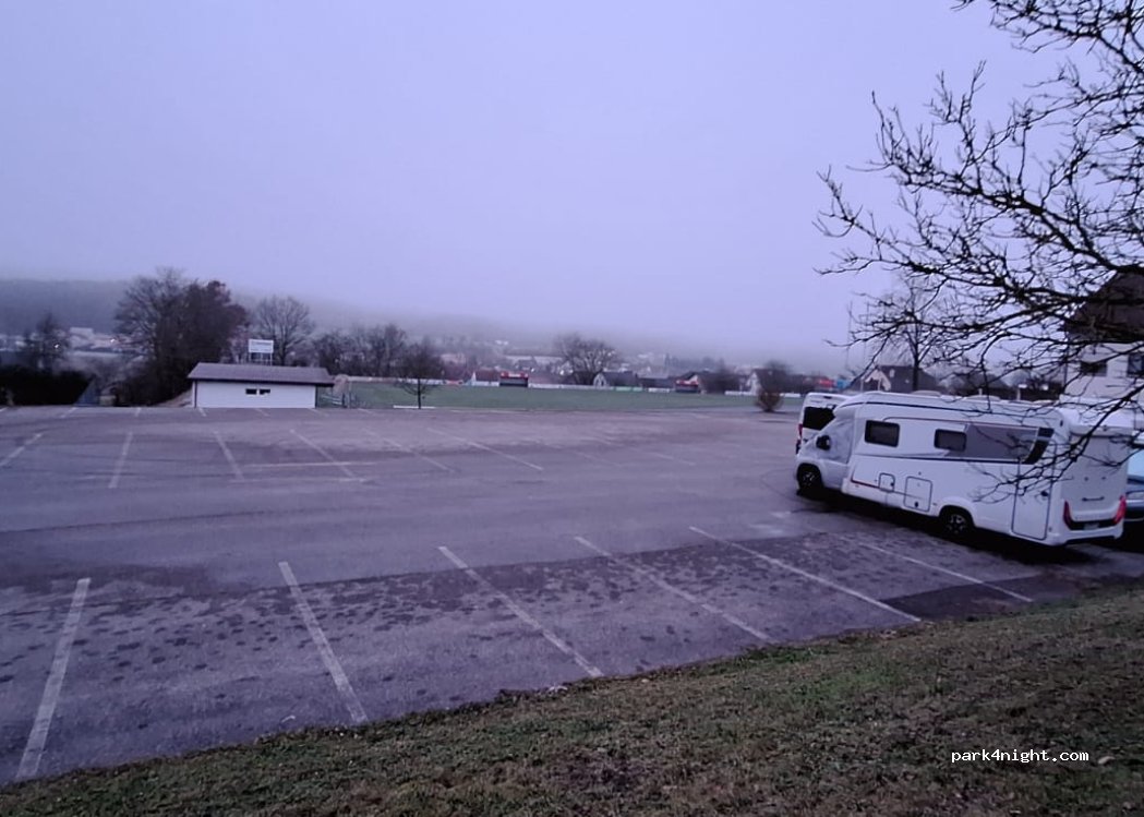 Großer Parkplatz, hinter dem Sportlerheim (freie Zufahrt durch das immer offene Tor des Sportgelände), Parkplatz 5. Gastronomie direkt am Parkplatz, Landgasthof Schwalbenberg. Auch für große Wohnmobile geeignet, asphaltierter Boden, keine V/E Sommerrodelbahn fußläufig Schaukel-Wanderweg geht direkt daran vorbei.