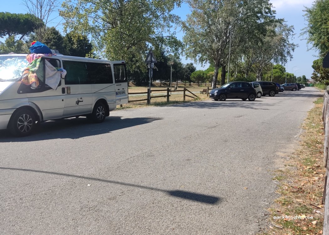 Posto perfetto, è un po' defilato ma è l'ideale per trascorrerci una o più notti, abbiamo dormito molto tranquilli, è circondato da due parchi e nel parco bimbi c'è una sorgente di acqua potabile. Nelle vicinanze ci sono diversi ristoranti. Non abbiamo visto nessun cartello che vieti nulla. C'è un'area picnic dove mangiare.