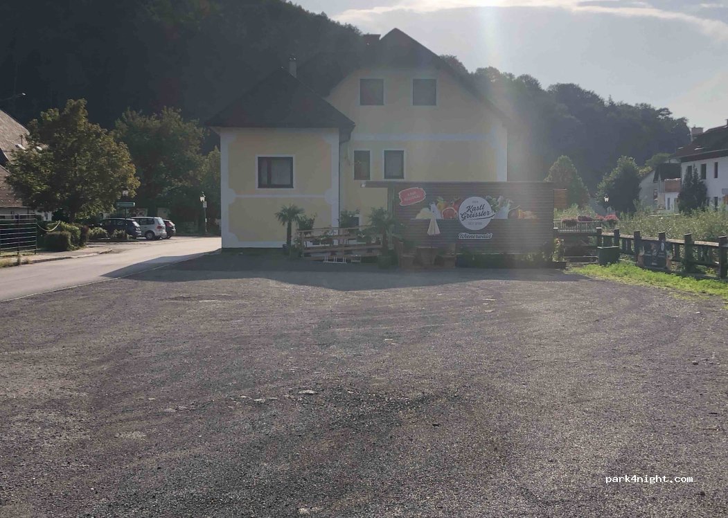 Ein einfacher und kostenloser Schotterplatz an einer Ortsdurchfahrt gelegen. Für eine Nacht ok, grade wenn es im Sommer im Tal sehr warm ist. Am Parkplatz hat seit wenigen Wochen ein kleiner aber hochwertiger Supermarkt mit regionalen Produkten eröffnet. Man hört die Kirchenglocken und die Straße bei geöffnetem Fenster.