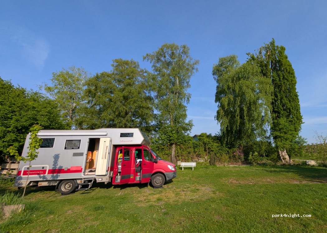4 emplacements seulement, presque dans la ferme.. très agréable et calme excepté le passage fréquent des tracteurs mais c'est une grosse exploitation. le vieux monsieur est très sympa et apporte des pommes de son verger tous les soirs. Dommage que mon allemand est nul, je n'ai rien compris à ce qu'il m'explique. plein d'eau offert au départ, sans payer. pas de vidange, c'était signalé.