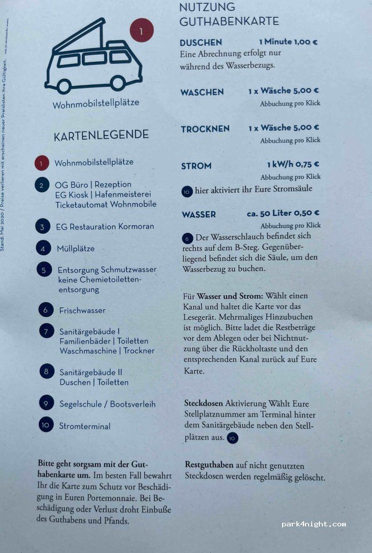 Sehr schöner Stellplatz direkt am Hafen. Saubere Sanitäranlagen, Abrechnung erfolgt über Guthabenkarte. Diese erhalten Sie am Automaten hinter dem Kiosk, Stellplatzverlängerung am Automaten möglich. Strom wird über Guthabenkarte verrechnet. Frischwasser gibt es an der Pier, blauer Schlauch, Abrechnung erfolgt an der Stromsäule (Wasser auswählen) gegenüber.
