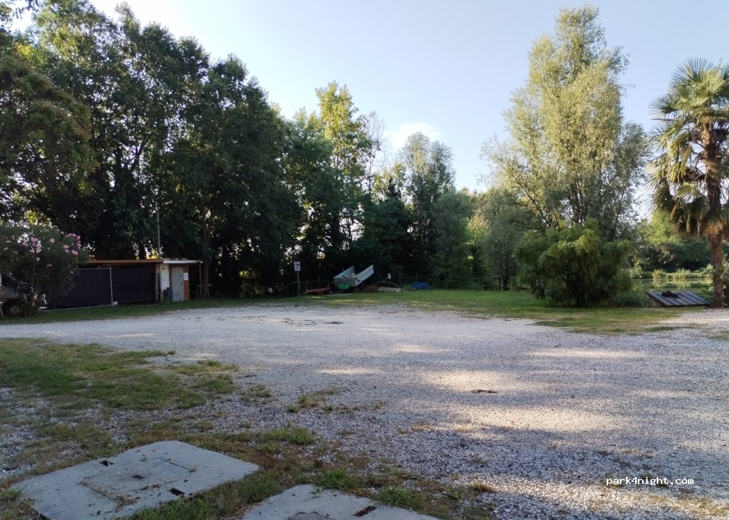 Petit espace pour se garer au bord du lac ( on peut se promener autour mais pas pêcher), pas vraiment en pleine nature mais agréable. Propriétaire très sympathique. Nous avons pris le train à piombino dese pour Venise, très pratique. 10 euros + 3 euros l’électricité, 1 euro la douche, ok pour une étape.