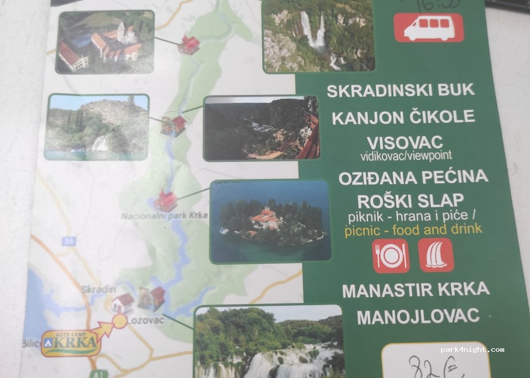 Camp Krka. Camp with shady pitches on rocky and very elevated terrain. The Krka waterfall "Skradinski Buk" is 8 km from the camp and the first market is 4 km away. The camp is nice but in the middle of nowhere.