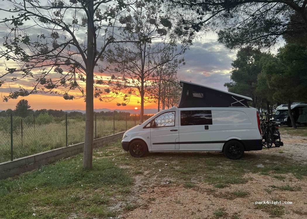 Wat een fantastische plek, super aardig personeel en fantastisch warme en schone douches. Er is grijs en zwart water afvoer en al het water is drinkbaar. Je hebt beschikking tot gratis wifi en elektra Je staat beschut tussen de pijnbomen en wellicht in de zomer een klein zwembad. Deze plek is op een steenworp van Krka, Skradin en Sibenik. Hier heb je kans op een mooie Oscar winnende zonsondergang