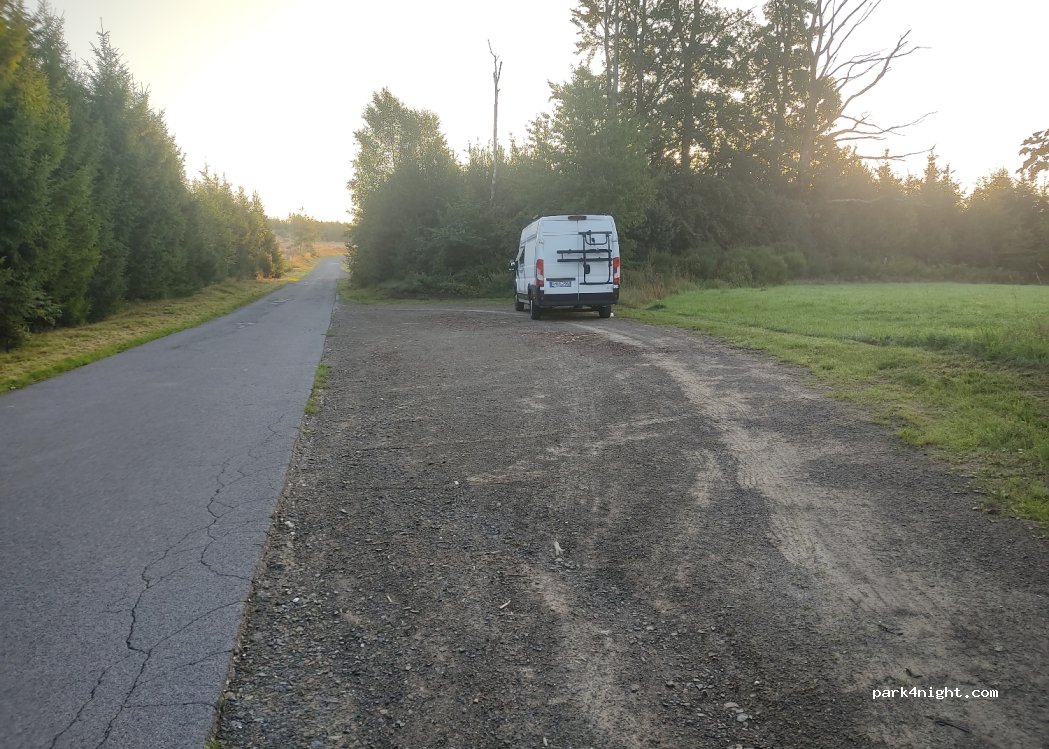 Nice, flat gravel place with a great view. There are several ways to go into the forest, for example to walk the dog. The parking lot is on a road with very little traffic.
